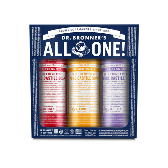 Our Pure-Castile Liquid Soap is concentrated, biodegradable, versatile and effective. Made with organic and certified fair trade ingredients, packaged in a 100% post-consumer recycled bottle. All-One!