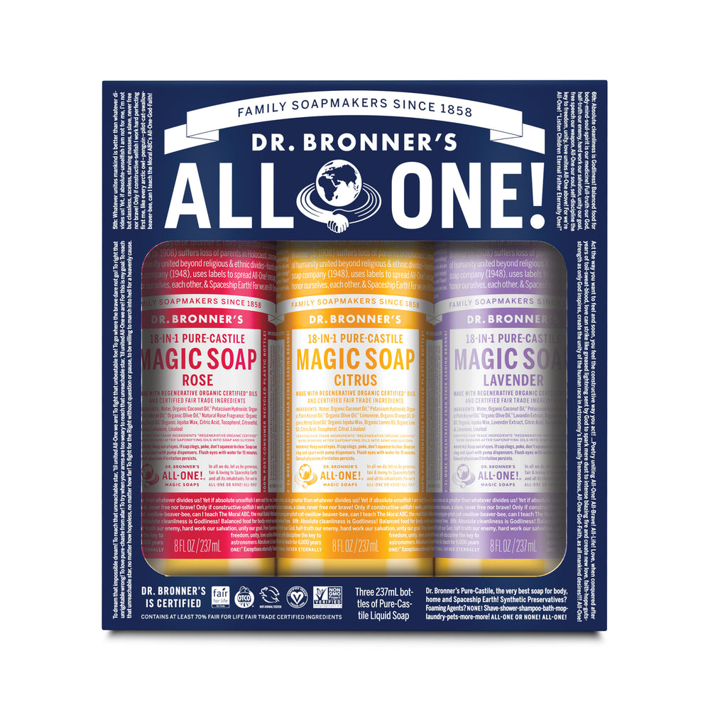 Our Pure-Castile Liquid Soap is concentrated, biodegradable, versatile and effective. Made with organic and certified fair trade ingredients, packaged in a 100% post-consumer recycled bottle. All-One!
