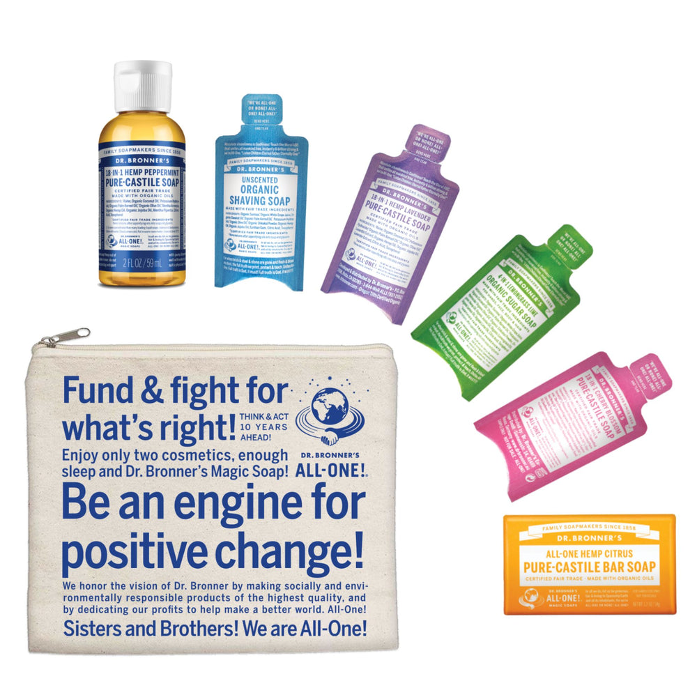 This deluxe sample pack comes in a reusable calico bag and includes a 59mL Pure-Castile Liquid Soap, a sample size Pure-Castile Bar Soap and a mix of four sachets.
