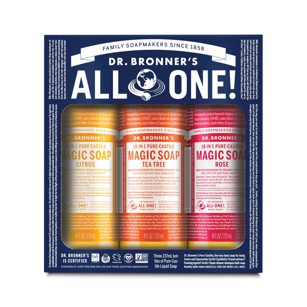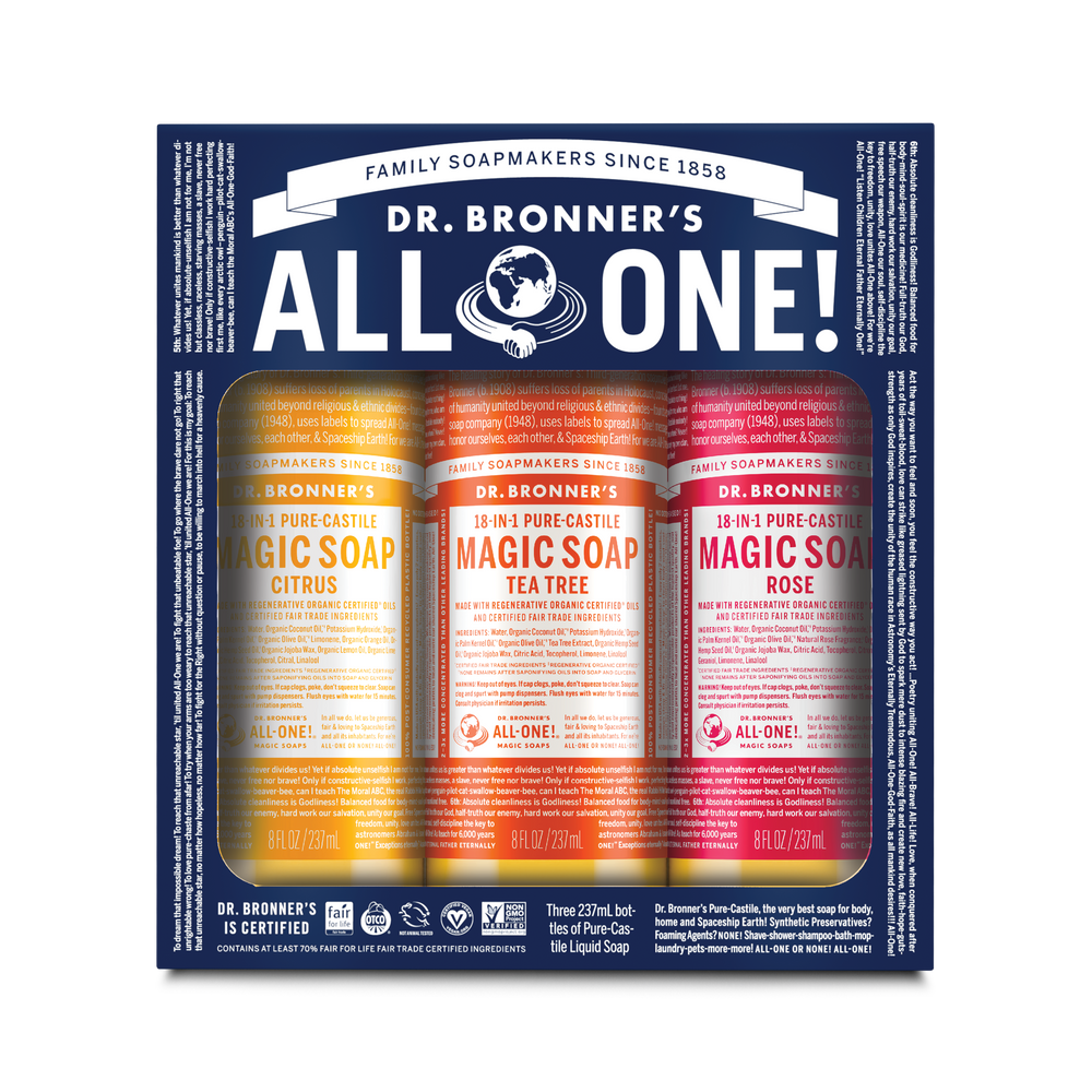 Our Pure-Castile Liquid Soap is concentrated, biodegradable, versatile and effective. Made with organic and certified fair trade ingredients, packaged in a 100% post-consumer recycled bottle. All-One!
